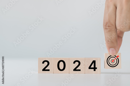 Wooden cubes with 2024 and goal icon on smart background. Starting to new year. 2024 goals of business or life. Business common goals for planning new project, annual plan, business target achievement