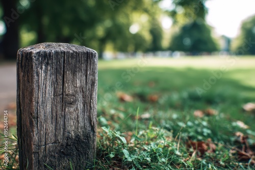 Wooden fence post marking a dog exercise area in a calm urban park