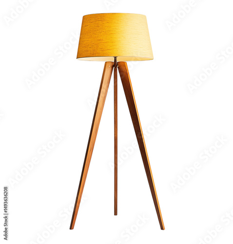 Wooden floor lamp with a white fabric shade, isolated on a transparent background, PNG format.