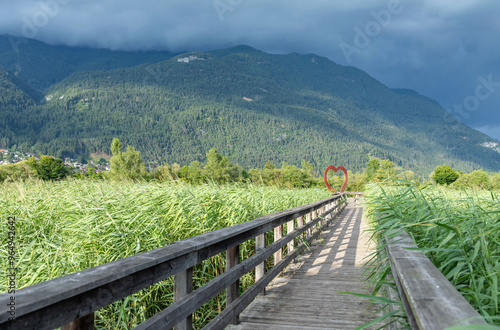 Wooden footbridge leading to heart sculpture against lush green mountains, dramatic cloudy sky, love concept