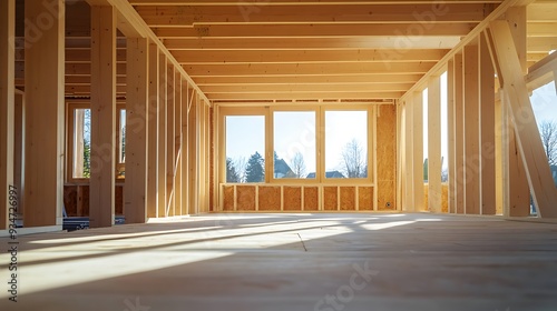 house, construction, wooden, frame, interior, window, sunlight, shadow, floor, wood, beam, wall, light, room, building, home, new, modern, unfinished, process, architecture, design, residential, development, real estate, project, future, growth, structure, support, foundation, framework, timber, plywood, paneling, glasses, daylight, bright, empty