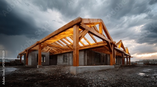 wood, construction, building, frame, truss, timber, structure, architecture, roof, under construction, site, sunset, evening, sky, dramatic, cloud, light, natural, material, beam, framing, modern, development, large, exterior, open, support, engineering, craftsmanship, brown, warm, industrial, empty, raw, concrete, strong, foundation, geometry, perspective, rural, build, progress, assembly, carpenter's shop, framework, column, commercial