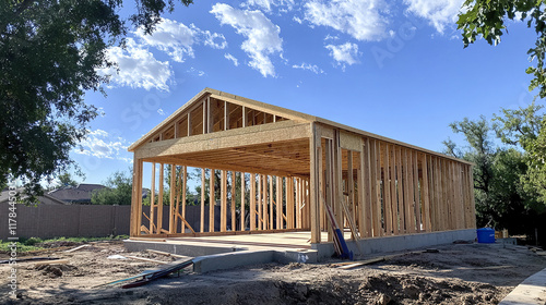 house, construction, wooden, framing, sky, building, architecture, site, beam, structure, residential, development, new, home, project, exterior, framework, carpenter's shop, unfinished, daylight, outdoors, foundation, roof, timber, real estate, engineering, suburban, lot, sunny, progress