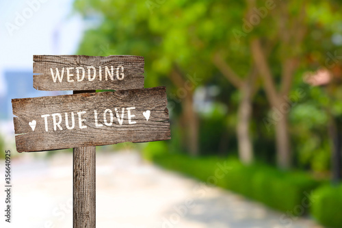 Wooden plaques with inscriptions Wedding and True Love outdoors, space for text