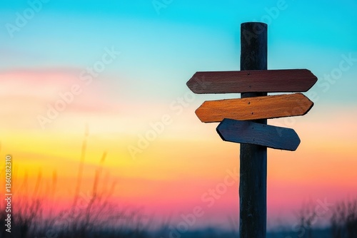 direction, signs, wood, post, travel, path, decision, choice, guidance, sunset, sky, landscape, journey, information, communication, navigation, alternative, option, destination, pointer, arrow, rustic, background, nature, evening, colours, light, dawn, dusk, horizon, silhouette, clear, scenic, adventure, marker, pole, pointing, wooden, different, vibrant, empty, open, route, exploration, freedom