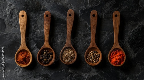Wooden Spoons Filled with Various Spices on Rustic Surface