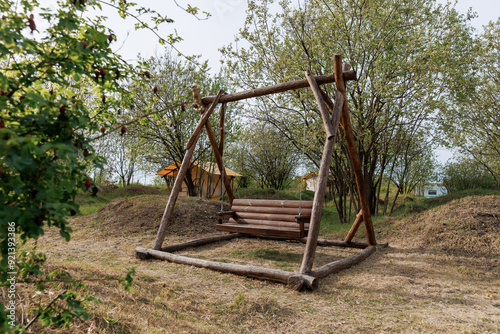 Wooden swing for rest in summer camp on background of camping tent for outdoor holiday and vacation