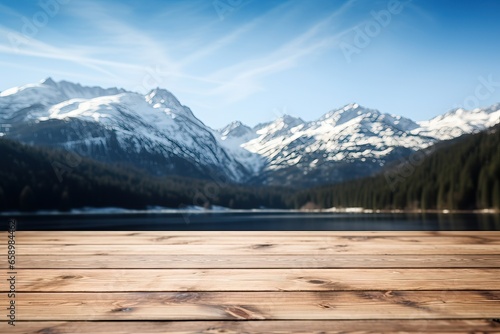 Wooden table in the front of picture with beautiful autumn scenery on Lake