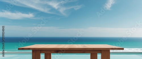 Wooden Table with Ocean View Background Ideal for Product Display Mockup and Advertising Use