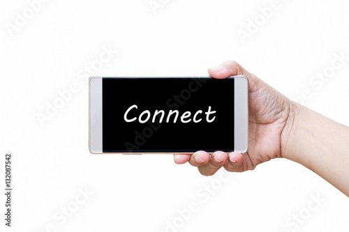Word connect,Man hand holding smart phone or cellphone isolated on white background with clipping path.