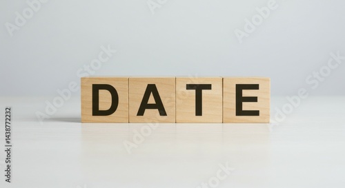 Word 'Date' composed with wooden letter blocks on bright white table.