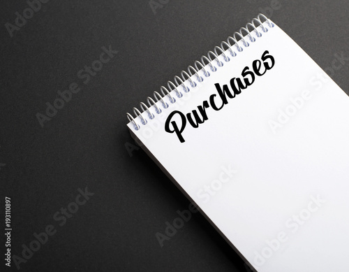 Word purchases written on notepad on black background. Concept Copy space. Mockup.
