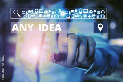 Word writing text Any Idea. Business photo showcasing Asking showing if they have thoughts about case or problem Woman wear formal work suit presenting presentation using smart device