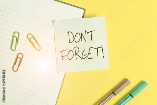 Word writing text Don T Forget. Business photo showcasing used to remind someone about important fact or detail Empty blue paper with copy space paper clips and pencils on the yellow table
