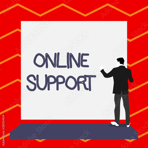 Word writing text Online Support. Business photo showcasing Assist customers for their complain Electronic interaction Short hair immature young man stand in front of rectangle big blank board