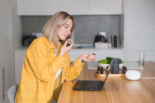 woman, home office, essential oil, aromatherapy, apartment, aroma, background, body, care, caucasian, comfortable, copy space, cosmetic, dermatology, dripping, emotion, essence, essential, extract, hand, healthy, herb, holiday, home, homeopathy, laptop, lifestyle, oil, online, organic, pharmacy, relax, relaxation, roller, room, skincare, smile, spa, therapy, treatment, vacation, weekend, well-being, wellness, woman, work