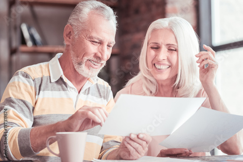 Work together. Pleasant cute senior couple sitting in the room by the table smiling and working with documents.