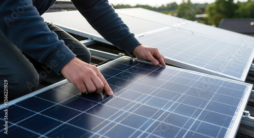 solar, panel, men at work, home, roof, renewable, energy, production, dark, jacket, blue, panel, sunlight, green, forest, background, sustainable, eco, friendly, technology, environment, clean, electricity, photovoltaic, system, professional, sunny, bright, nature, solution, innovation, installation, setup, residential, modern, future, alternative, power, job, detail, sharpened, landscape, clear, sky