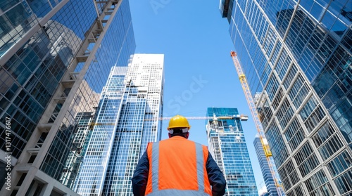 Worker in orange safety vest and yellow helmet observes city skyscrapers with cranes and glass facades under bright blue sky. Concept of urban construction. Ai generative