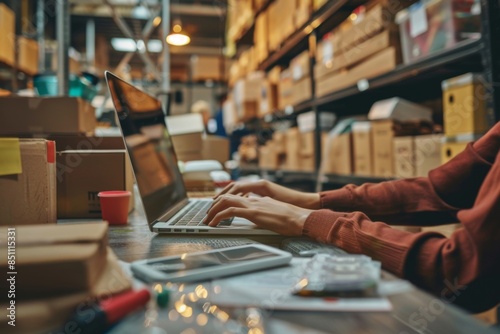men at work, warehouse, laptop, box, background, e-business, delivery, logistic, online, order, cardboard box, technology, shipping, retail, client, cardboard, merchandise, supply, chain, business, mobile, device, inventory, storage, consumer, good, connection, communication, service, commerce, fulfillment, hand, keyboard, modern, cyberspace, free space, copy space