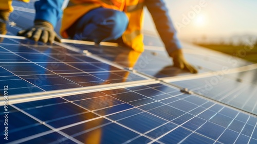 Worker installing solar panels on rooftop at sunset, ensuring clean and renewable energy production in a sustainable and eco-friendly manner.