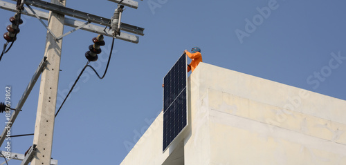 adult, adults only, aerial view, blue, business, clear sky, construction industry, control panel, copy space, domestic life, electrical equipment, electrician, electricity, energy, engineer, engineering, environmental conservation, equipment, horizontal, house, installing, male, man, occupation, one man only, power supply, renewable energy, repairing, rooftop, safety, service, sky, social issue, solar cell, solar energy, solar panel, spain, technician, technology, wireless technology