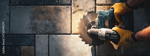construction, drilling, drill, men at work, hand, glove, paving, paver, stone, tile, installation, renovation, building, tool, equipment, hard work, manual labor, job, professional, sunlight, sunset, closeup, concrete, ground, home improvement, masonry, craftsmanship, contractor, site, industrial, repair, maintenance, technology, automation, detail, grit, dust, safety, protection, project, modern, infrastructure, sidewalk, patio, laying, flooring