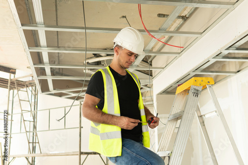 measuring, equipment, working, repairman, build, profession, builder, men at work, construction site, industry, male, occupation, industrial, foreman, helmet, man, contractor, hard hat, job, work, vest, safety, caucasian, building, professional, people, hat, adult, workplace, clothing, wear, renovation, handyman, size, ladder, ceiling, plasterboard, profile, steel, metal