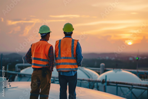 Workers in protective gear, LNG terminal, pipeline, storage tanks, safety, industrial setting.