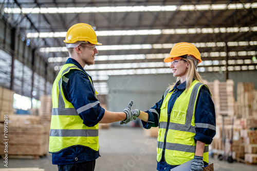 workers man and woman engineering walking and handshakeing with working suite dress at warehouse. Concept of smart industry worker operating. Wood factories produce wood palate