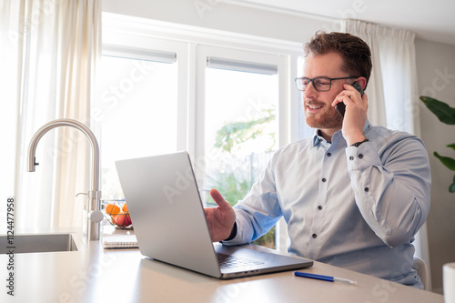 office, working, kitchen, male, business, home, house, guy, man, caucasian, middle-aged, grey, brown hair, tied-up, laptop, 40s, 40, year, old, tap, horizontal, goggles, window light, natural, counter, modern, income, call, phone, happy, thinking, creating, businessman, computer, photogenic, people, notebook, person, professional, job, corporate, executive, man, technology, cyberspace, manager