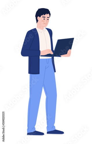 Working man with laptop semi flat color vector character. Male freelancer. Editable figure. Full body person on white. Simple cartoon style spot illustration for web graphic design and animation