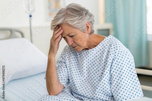 hospital, senior, woman, patient, sad, ill, sick, worried, health care, elderly, old, age, pain, suffering, upset, distressed, medicals, gown, doctor, nurse, clinic, treatment, disease, disease, health, ageing, senior citizen, hospital room, medical care, well-being