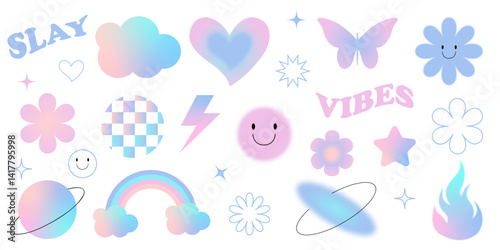 Y2K aesthetic blurred gradient stickers. Retro icons, smiley faces, stars, daisy, flower & pastel vibes