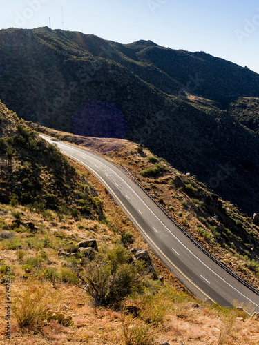 road, mountain, landscape, travel, mountain, sky, nature, highway, asphalt, scenic, outdoors, way, desert, winding, curve, rock, route, blue, summer, transportation, nobody, green, driving, arizona, backroad