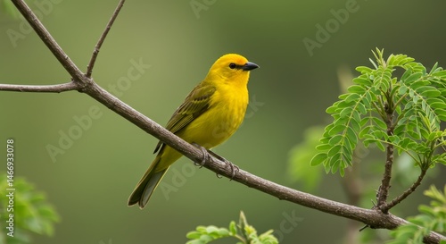 Yellow Bird on Branch - A vibrant yellow bird perches on a slender tree branch, surrounded by lush green foliage
