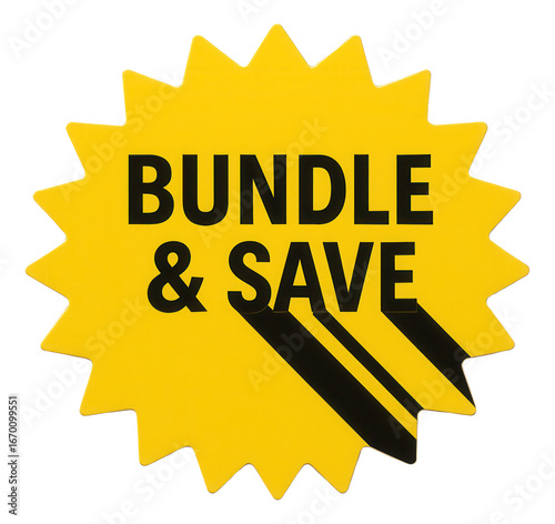 Yellow burst sticker with BUNDLE & SAVE offer in bold letters, effective retail discount promo on transparent background.