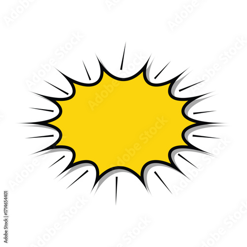 Yellow comic starburst bubble with black outline, blank pop art explosion shape, retro cartoon blast frame for text, comic speech design element on white background