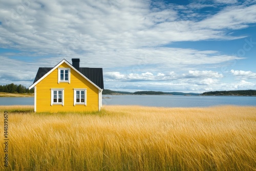 bungalow, house, yellow, lake, water, summer, field, gold, rural, nature, landscape, calm, peaceful, exterior, cabin, idylli, vacation, travel, view, beautiful, dream, home, property, simple, sky, cloud, grass, harvester, quiet, tranquil, relaxing, summer, holiday, tour tourism, scenic, rustic, architecture, design