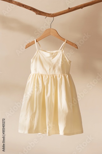 dress, hang, casual attire, minimalist, neutral, soft, indoor, display, clothing, hanger, wood, tree branch, fabric, cream, summer, spring, day, wear, sundress, strap, beige, apparel, studio, simple, light, garment, background, textile, fashion, girl, youth, cotton, style, daytime, indoor