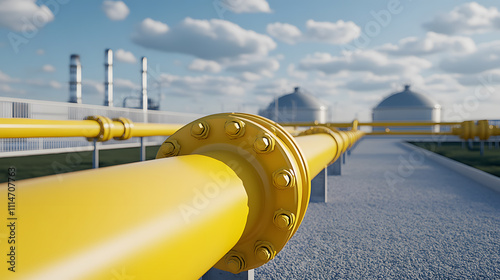 Yellow Gas Pipe with Gas Storage in the Background - Industrial Setup for Gas Distribution and Storage