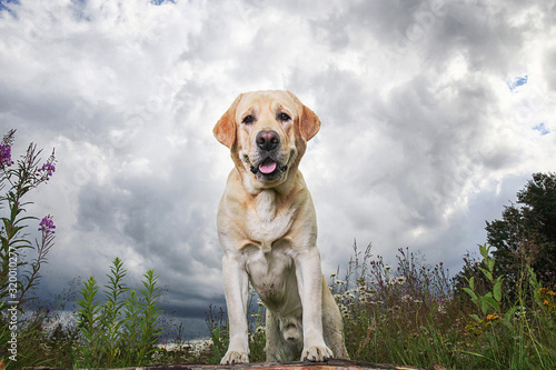 dog, field, labrador, retriever, meadow, cloudy, obedient, pet, happy, adorable, cute, healthy, active, attention, discipline, animal, canino, yellow, breed, friends, companion, domestic, pedigree, purebred, loyal, behaviour, paw, forepaw, log, green, grass, nature, summer, wood, forest, faithful, flower, glade, stormy, sky, outdoors, copy space