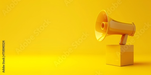 Yellow megaphone loudspeaker symbol on a yellow cube block against bright background with copyspace for text