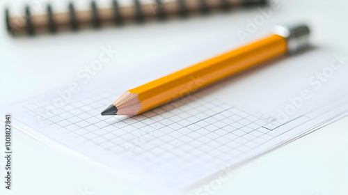 Yellow Pencil On Grid Paper With Blurred Spiral Notebook In White Background