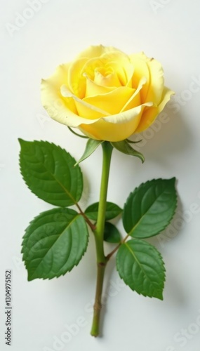 Yellow rose with delicate green leaves on white, rose, yellow, leaf