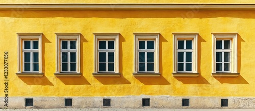 Yellow wall with five windows and shadows showcasing architectural details and design features copy space