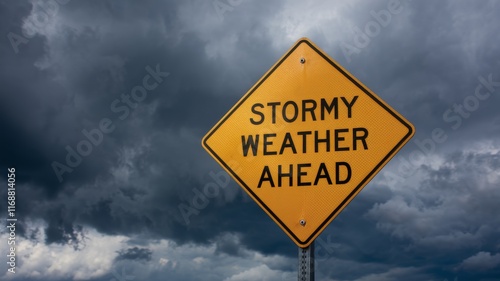Yellow Warning Sign "Stormy Weather Ahead" Against a Dark, Cloudy Sky.