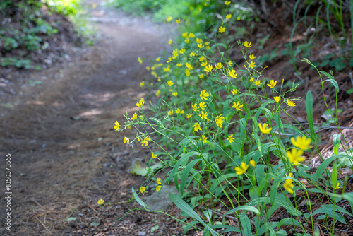 wildflower, yellow, blossom, nature, forest, path, trail, summer, green, leaf, flora, foliage, copy space, dirtied, stem, garden, country road, fresh air, calmness, vitality, harmony, simplicity, purity, serenity, peace, growth, resilience, beauty, meditation, ecotourism, environmental protection, wellness