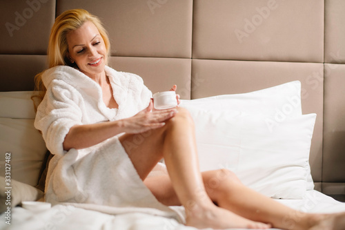 Young woman in bathrobe use the cream for the body. Beautiful woman enjoying in hotel.