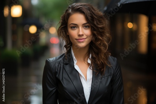 Young adult businesswoman in city street, smiling confidently at camera. Generated AI